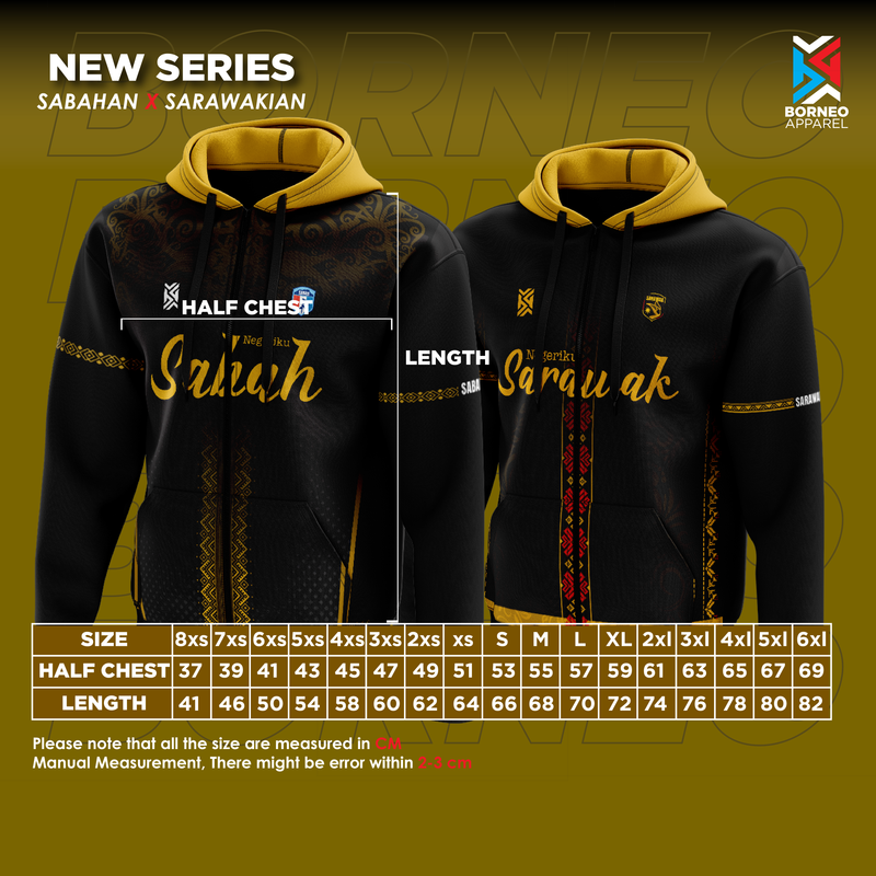Memperkenalkan Edisi Pertama 2022, Special Edition Hoodie Borneo Direka Khas Untuk Sabahan & Sarawakian. Buat pertama kali dalam sejarah Borneo Apparels, kami mengeluarkan edisi hoodie dengan design ekslusif Official dari Borneo Apparels. Series kali ini juga disertai pelbagai pilihan jenis jersey iaitu jersey short sleeve, long sleeve, berkollar , kanak-kanak & muslimah dengan Harga Yang Sama iaitu RM55 sahaja tanpa cas tambahan!